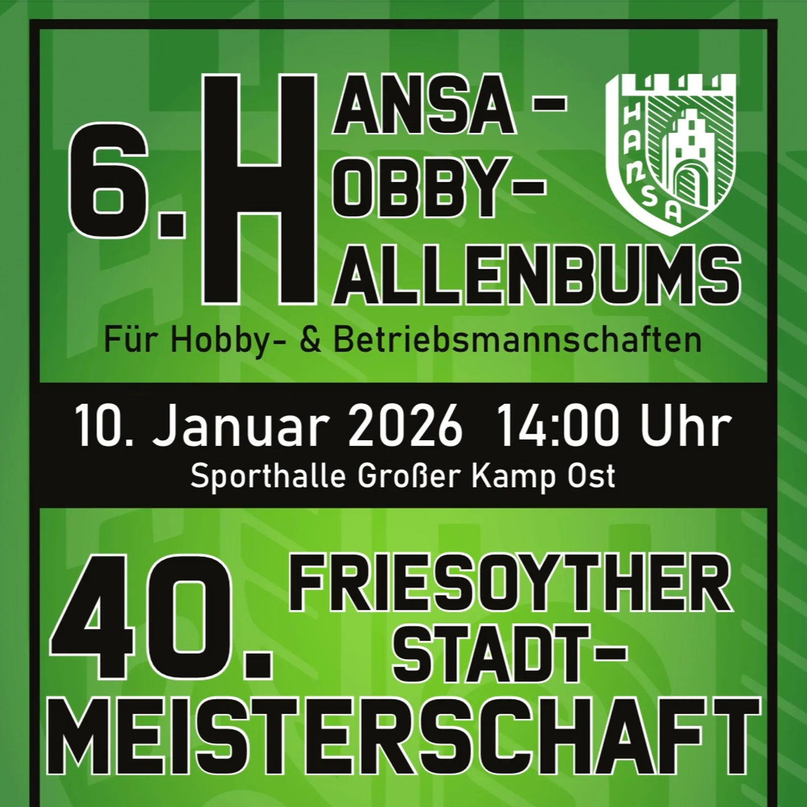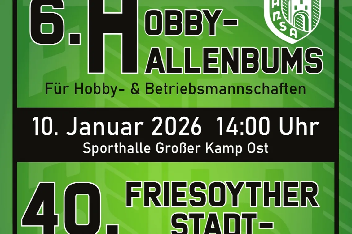 Am Samstag und Sonntag (10./11. Januar 2026) finden wieder die alljährlichen Hallenturniere des SV Hansa statt. Zunächst steigt ab Samstagmittag der 6. Hobby-Hallenbums mit Hobby- und Betriebsmannschaften. Ein bunter Mix mit vielen Teams und guter Stimmung ist zu erwarten. Organisiert wird das Turnier von unserer dritten Herrenmannschaft, Hansa Tres(en).